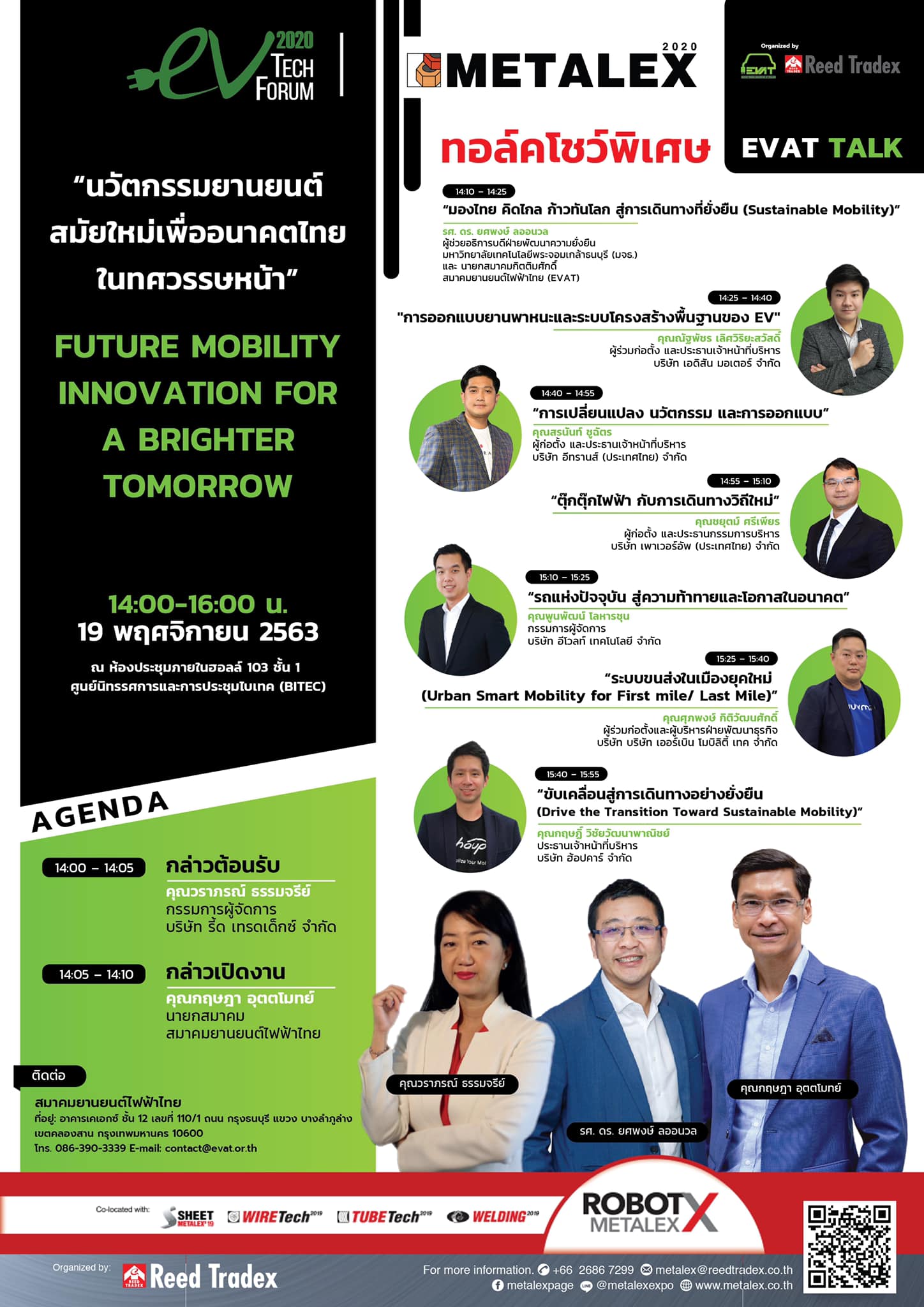 เมื่อวันที่ 19 พฤศจิกายน 2563 สมาคมยานยนต์ไฟฟ้าไทย จัดงาน EVAT TALK SHOW ซีรี่ส์ชุดใหม่ เพื่อการเดินทางที่ยั่งยืน ในหัวข้อ “FUTURE MOBILITY INNOVATION FOR A BRIGHTER TOMORROW นวัตกรรมยานยนต์สมัยใหม่เพื่ออนาคตไทยในทศวรรษหน้า” รวมพลคนรุ่นใหม่เดี่ยวไมค์ สร้างสรรนวัตกรรมยานยนต์ของคนไทย สู่การเดินทางที่ยั่งยืน ภายใต้งาน Metalex 2020 จัดร่วมกับ Reed Tradex นำโดย คุณกฤษฎา อุตตโมทย์ Jon Krisda นายกสมาคมยานยนต์ไฟฟ้าไทย และคุณวราภรณ์ ธรรมจรีย์ กรรมการผู้จัดการ บริษัท รี้ด เทรดเด็กซ์ จำกัด ร่วมกล่าวเปิดงาน และช่วงทอล์กโชว์พิเศษ ซึ่งมีหลายหัวข้อน่าสนใจมาก อาทิ 'มองไทย คิดไกล ก้าวทันโลก สู่การเดินทางที่ยั่งยืน (Sustainable Mobility)' นำเสนอโดย รศ. ดร. ยศพงษ์ ลออนวล ผู้ช่วยอธิการบดีฝ่ายพัฒนาความยั่งยืน มหาวิทยาลัยเทคโนโลยีพระจอมเกล้าธนบุรี และ นายกสมาคมกิตติมศักดิ์ สมาคมยานยนต์ไฟฟ้าไทย 'การออกแบบยานพาหนะและระบบโครงสร้างพื้นฐานของ EV' นำเสนอโดย คุณณัฐพัชร เลิศวิริยะสวัสดิ์ ผู้ร่วมก่อตั้ง และประธานเจ้าหน้าที่บริหาร บริษัท เอดิสัน มอเตอร์ จำกัด “การเปลี่ยนแปลง นวัตกรรม และการออกแบบ” นำเสนอโดย คุณสรนันท์ ชูฉัตร ผู้ก่อตั้ง และประธานเจ้าหน้าที่บริหาร บริษัท อีทรานส์ (ประเทศไทย) จำกัด “ตุ๊กตุ๊กไฟฟ้า กับการเดินทางวิถีใหม่” นำเสนอโดย คุณชยุตม์ ศรีเพียร ผู้ก่อตั้ง และประธานกรรมการบริหาร บริษัท เพาเวอร์อัพ (ประเทศไทย) จำกัด “รถแห่งปัจจุบัน สู่ความท้าทายและโอกาสในอนาคต” นำเสนอโดย คุณพูนพัฒน์ โลหารชุน Nics Loharjun กรรมการผู้จัดการ บริษัท อีโวลท์ เทคโนโลยี จำกัด “ระบบขนส่งในเมืองยุคใหม่ (Urban Smart Mobility for First mile/ Last Mile)” นำเสนอโดย คุณศุภพงษ์ กิติวัฒนศักดิ์ ผู้ร่วมก่อตั้งและ ผู้บริหารฝ่ายพัฒนาธุรกิจ บริษัท บริษัท เออร์เบิน โมบิลิตี้ เทค จํากัด “ขับเคลื่อนสู่การเดินทางอย่างยั่งยืน (Drive the Transition Toward Sustainable Mobility)”นำเสนอโดย คุณกฤษฏิ์ วิชัยวัฒนาพาณิชย์ ประธานเจ้าหน้าที่บริหาร บริษัท ฮ้อปคาร์ จำกัด